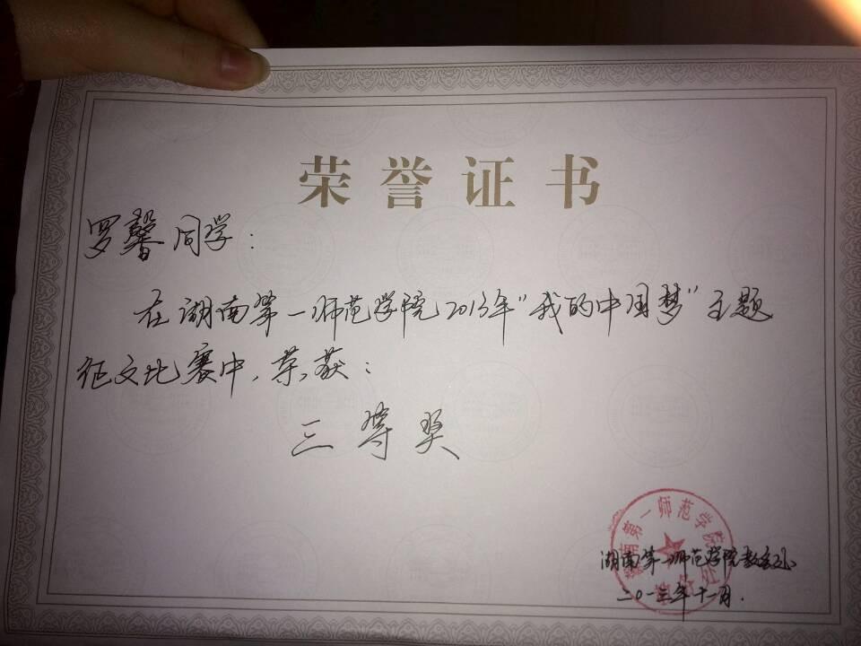 2013年beat365官方网站“我的中国梦”主题征文比赛中,罗馨荣获此次比赛三等奖。罗馨表示通过这次比赛不仅锻炼了自己的能力,同时让她更加清晰的了解了自己。她希望自己今后能够参加更多类似的比赛,并且取得更好的成绩。