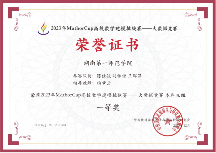 2023年第四届MathorCup高校数学建模挑战赛——大数据竞赛圆满落下帷幕,beat365官网四支参赛队伍在激烈的竞争中脱颖而出,斩获了全国研究生组二等奖1项,本科生组一等奖3项。这一骄人成绩的取得,正是参赛队员们的辛勤付出和指导教师的悉心指导的结果。