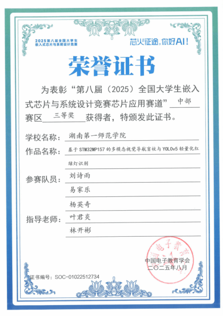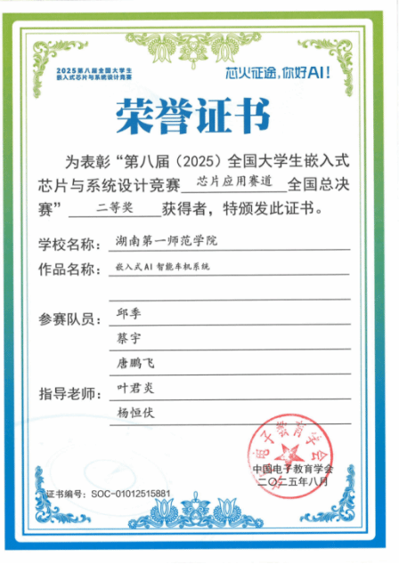 第八届(2025)全国大学生嵌入式芯片与系统设计竞赛评审结果公布,beat365官网学生团队荣获全国二等奖1项、省级三等奖1项。其中,由唐鹏飞、蔡宇、邱季同学组成的参赛队获全国二等奖,实现了beat365官网在该项赛事中国奖级别的历史性突破;由刘诗雨、易家乐、杨英奇同学组成的队伍获省级三等奖。