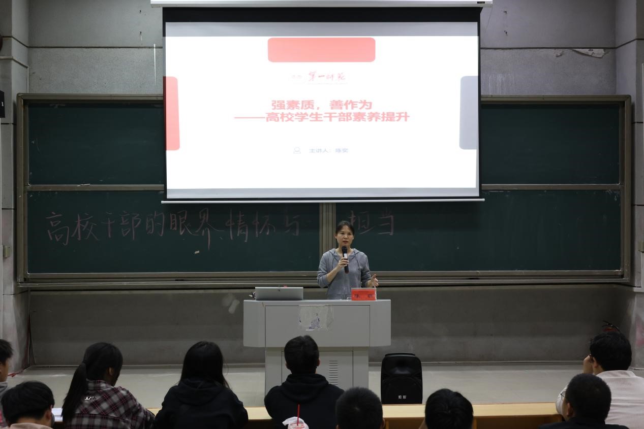 陈奕以学生干部应具备的素质为切入点,详细阐述了学生干部应具备的素养。她指出,作为学生干部,不仅要具备扎实的专业技能,更要有广阔的视野和深厚的情怀,要勇于担当,积极作为。她强调,学生干部要有积极向上、大度宽容的心态,理性分析、协调处理的能力以及勇于担责、善于担责的魄力,她还强调了做人做事要为人正直、注重诚信、善于沟通、学会尊重,要努力成为堪当民族复兴重任的时代新人。