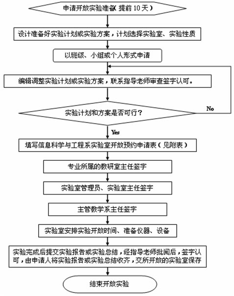1、实验室面向全系学生开放,实行项目申报制度。即由指导教师指导学生填写《信息科学与工程系实验室开放预约申请表》,经教研室、系教学主任审批后执行。