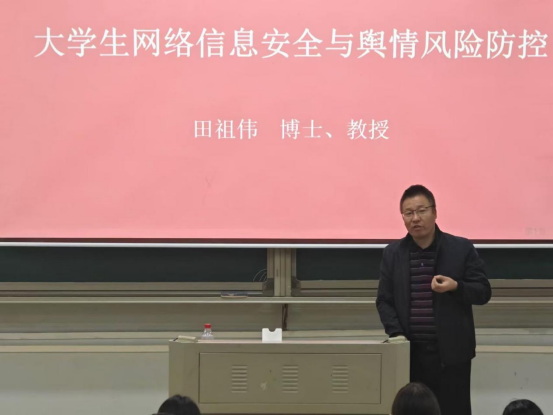 田祖伟从网络安全形势、网络安全法规、舆情风险防控三个方面讲述了网络信息安全与舆情风险防控的重要性与必要性。他以网络病毒的来源、种类等为切入点,讲述了网络病毒的危害,结合网络案件实例分析了网络安全形势,强调了网络安全的必要性,带领入党积极分子们了解和学习了网络安全法规及舆情风险防控相关内容。